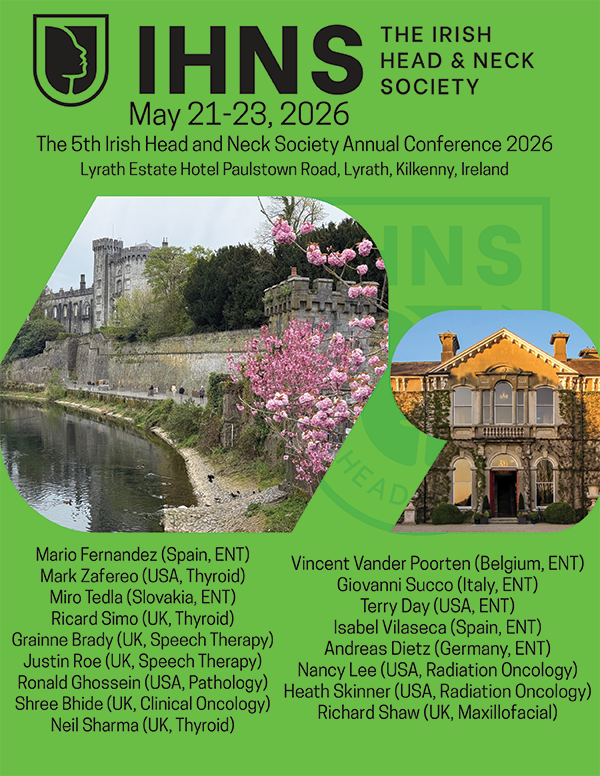 After the resounding success of the 4th Annual Irish Head and Neck Society meeting last April, we are delighted to announce that the 5th annual meeting of the IHNS will take place on the 21st-23rd May 2026 at the Kilkenny Convention Centre, Kilkenny, Ireland.